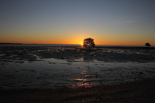 | We made it to the beach, to watch it set behind a lone mangrove and over the mud flats. |